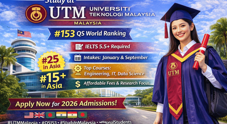 Universiti Teknologi Malaysia (UTM) মালয়েশিয়ার অন্যতম সেরা পাবলিক গবেষণা-ভিত্তিক বিশ্ববিদ্যালয়, বিশেষ করে ইঞ্জিনিয়ারিং, বিজ্ঞান ও প্রযুক্তি ক্ষেত্রে আন্তর্জাতিক মানের শিক্ষা প্রদান করে। এটি QS World University Rankings 2026-এ বিশ্বব্যাপী #153 স্থান দখল করেছে এবং QS Asia Rankings-এ #25 অবস্থান পেয়েছে — যা এটিকে গবেষণা-চালিত অভিজ্ঞতা সম্পন্ন একটি বিশ্ববিদ্যালয় হিসেবে প্রমাণ করে। Universiti Teknologi
